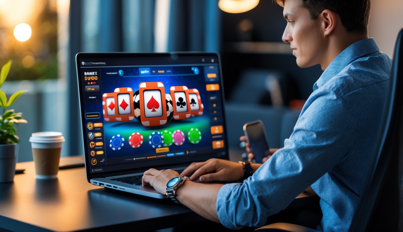 Seorang pria muda duduk di meja modern bermain poker online menggunakan laptop dengan chip dan kartu poker di sekitarnya.